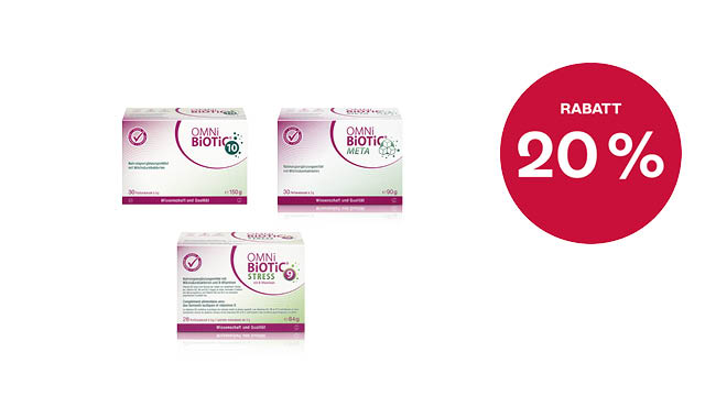 Jetzt 20 % Rabatt beim Kauf von OMNi-BiOTiC® 10, OMNi-BiOTiC® Stress und OMNi-BiOTiC® Meta.